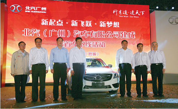 基地投产,预示着广州公司迎来了新起点、新飞跃、新梦想。北汽广州基地投产之后,将把产品的品质与质量作为企业发展的生命线,狠抓精益生产与质量管理,努力提升北汽品牌的知名度与美誉度。“我相信,在不久之后,一辆辆崭新的‘北京’牌汽车将以可靠的质量和优越的性能从北汽广州基地步入市场,并获得市场认可;我相信,由大变强、走向世界的‘北汽梦’终将变为现实!”随后,陈建华、欧阳卫民、罗思源等领导共同启动了首辆新车下线,并逐一在新车车身上签名留念。